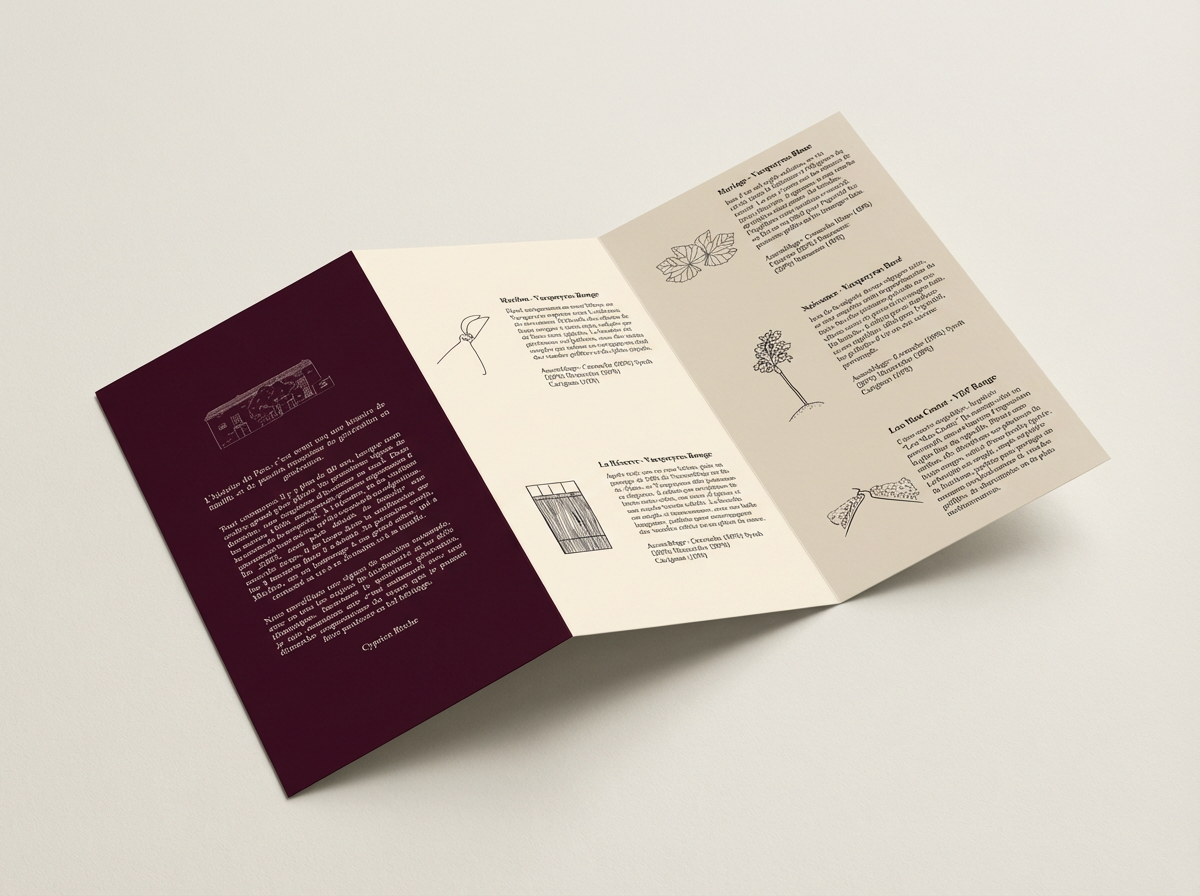 La brochure, quant à elle, présente les différentes cuvées du Parc à travers un parti pris graphique fort : la représentation des Dentelles de Montmirail, majestueuses silhouettes qui surplombent le domaine.